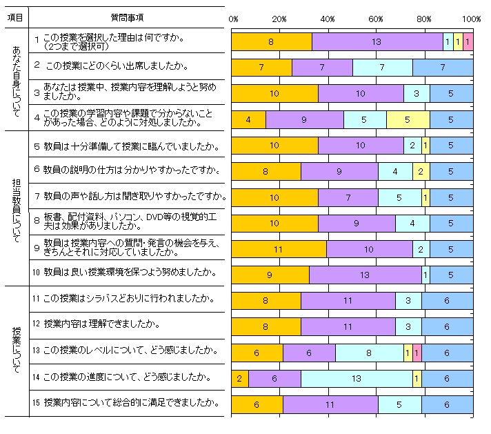 【担当教員のコメント】前回のアンケートでは10の「教員の声や話し方は聞き取りやすかったですか」の質問に対して、声が小さすぎるとの批判があったので、マイクを使用するなど工夫したので改善されたと思う。しかし、16の「この授業のレベルについてどう感じましたか」という質問に対しては、「難しすぎる」と「やや難しい」の合計が「ちょうどよい」を超えている点は,反省すべきだと思う。 |