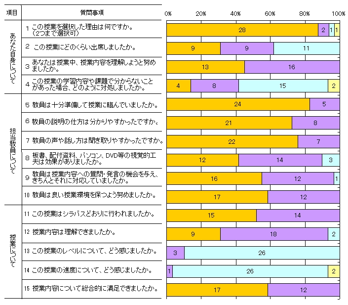 【担当教員のコメント】この授業評価アンケートを実施した日が大雪だったため欠席者が多く、回答数が十分でないのが残念です。 |