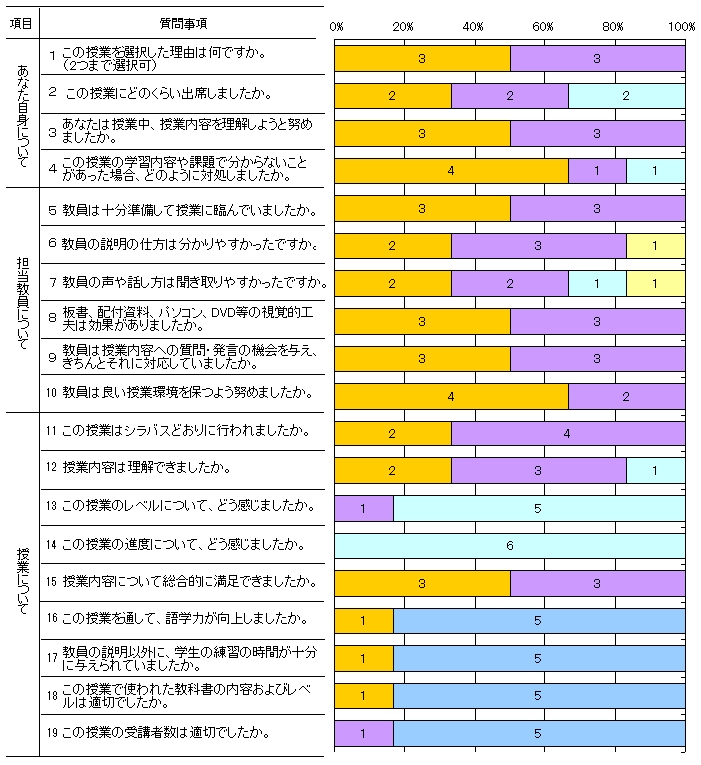| 授業形態 | 語学 | 回答者数 | 6人 |