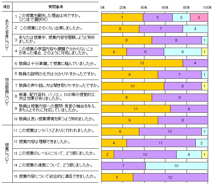 【担当教員のコメント】言葉づかいや話すスピードについて、改善していくつもりです。より多くの学生のニーズに応えられるよう、授業内容とレベルについてはこれからも、学生たちの反応を見ながら工夫していく予定です。 |