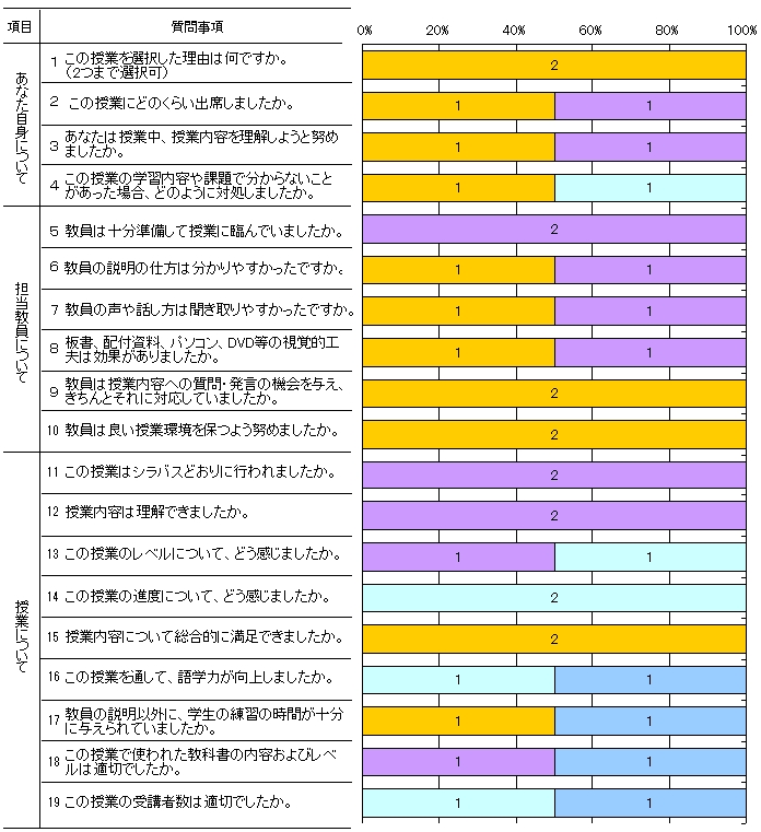 | 授業形態 | 語学 | 回答者数 | 2人 |