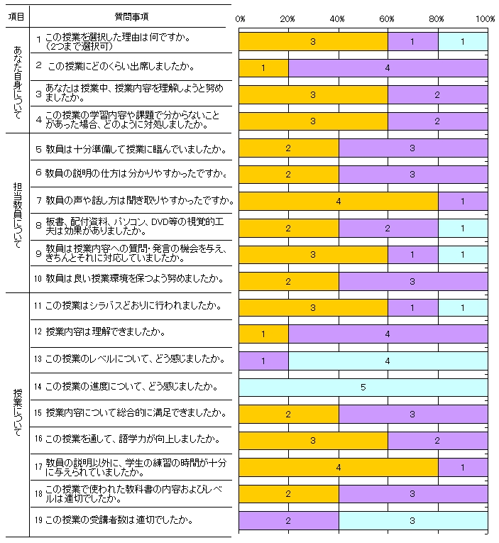 | 授業形態 | 語学 | 回答者数 | 5人 |