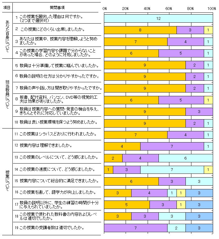 | 授業形態 | 語学 | 回答者数 | 12人 |